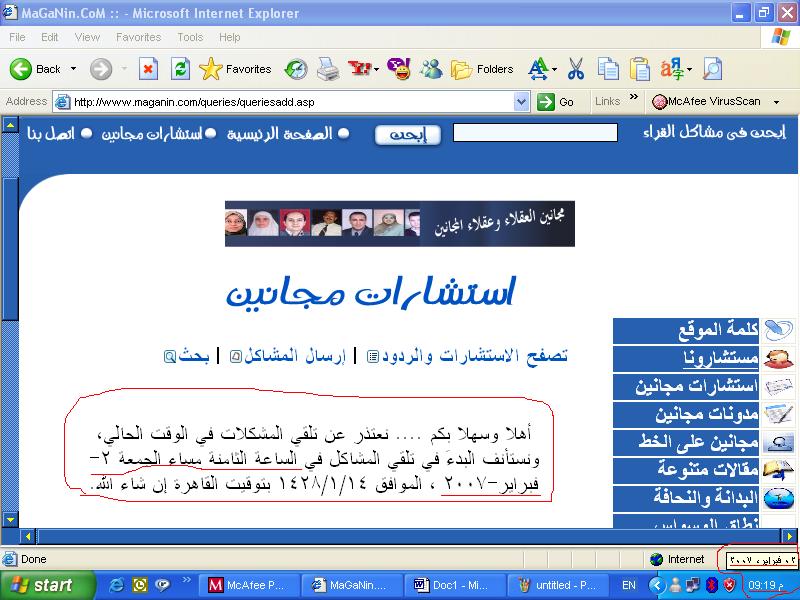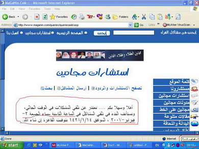 في التاسعة والنصف إلا دقائق ثلاث من مساء الجمعة 2 فبراير 2007 أرسلت ابنتنا صاحبة هذه المشكلة نفس النص السابق على بريدي الشخصي معنونا بـ: "حتى لو مش مصدق دون لود الصورة وشوفها"، وكانت الصورة هي التي تظهر لكم تحت هذا الكلام.... لتشير إلى نسياننا فتح بوابة تلقي المشكلات في الوقت الموعود!