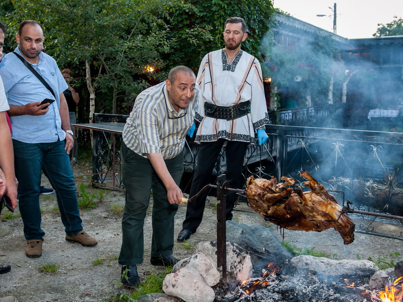 المكان الذي تناولنا فيه عشائنا كان مزرعة حولها صاحبها وزوجته وأولادهما إلى مطعم سياحي كل ما يقدم فيه هو من إنتاج المزرعة بما في ذلك الخروف المشوي ..... ... قدموا لنا شيئا كشوربة الخضار لكنها كانت ذرات خضار مختلف في كل مغرفة لا تزيد عن ثلاثة إلى أربعة .... ولا ندري ولم نسأل لكن لا أظن أحدا منا تخيلها شوربة الضأن لأنها كانت في أحسن الأحوال شوربة آثار خضار ... كنا في منتهى الجوع ... وقدموا أطباق الخيار المخلل الخيار محبب وليس كالذي نعرفه، خيار روماني .. لكن لاحظت أني الوحيد الذي استغرب ... قلت لعله سلالة يعرفها كثير غيري ... بدأ بعد ذلك على يميني في ممر على جانب ما يشبه حوض الماء رقص شعبي من مجموعة من الأطفال على لحن موسيقي جميل بدا وكأنه خاص بالمكان بعضنا كالدكتور منتصر كان من أوائل من قاموا يصورون بالفيديو ...... والحقيقة أنني لاحظت شيئا أهم يجري في الناحية الأخرى من حوض الماء ألا وهو الخروف الذي سيشوى ولما بدا الخروف أقرب لأن يكون مشويا في مكان ما قبل حضورنا ... فقد جاءني الرد أسرع مما توقعت، وكنت عندما بدأت ألمح مكان الشواء وقد نصبت فوقه الدعائم الحديدية لآلة الشواء وأشعل النار في الحطب وانتظروا حتى هدوء اللهيب ... كنت في حيرة بين رغبتي أن أرى الخروف يشوى من الألف إلى الياء ورغبتي أن أسد جوعي الذي أزكته الطبيعة التي تبدو كأنها بكر وما هي ببكر ! .... نهايته قمنا فأخذنا الصور مع الخروف على المشوى .... وغطا وجوهنا الدخان ورغم ذلك رضينا بالصور، ويظهر معي رفيق الحافلة الدائم د. لطفي الشربيني، كما يظهر في الصورة المجمعة ويليه د. أسامة الخولي ثم على يساري د. وفيق الشيخ ود. محمود الإبياري وخالد الشرقاوي ثم محمد مصطفى شهاب، وفي الصورة الثالثة يظهر د. إيهاب ملوخية مهرولا إلى جواري في اتجاه الخروف.